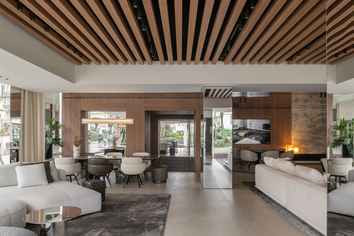 On the ground floor, curated living and dining areas showcase the latest collections—including iconic pieces from the 2025 series—set against a backdrop of Silver Wild Travertine, Frozen Walnut, and mirrored surfaces. The lower level offers a more intimate setting, featuring lounge, night, and outdoor configurations that evoke the warmth of a private home.